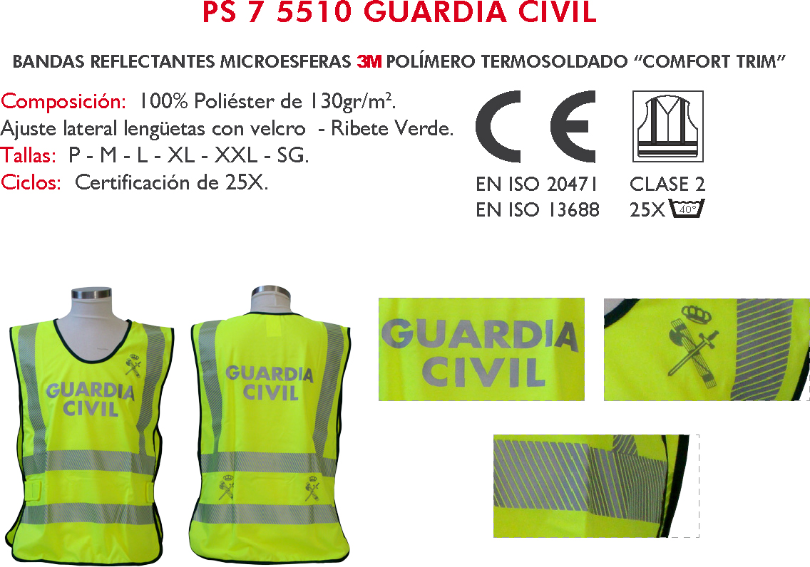 PETO FLUORESCENTE-REFLECTANTE PS-7 5510 GUARDIA CIVIL Ref: PS-7 5510 GUARDIA CIVIL Composición100% Poliéster de 130 gr/m2 - Cierre por velcro - Ribete Marino TallasP - M - L - XL - XXL - SG CiclosCertificación de 25 CICLOS